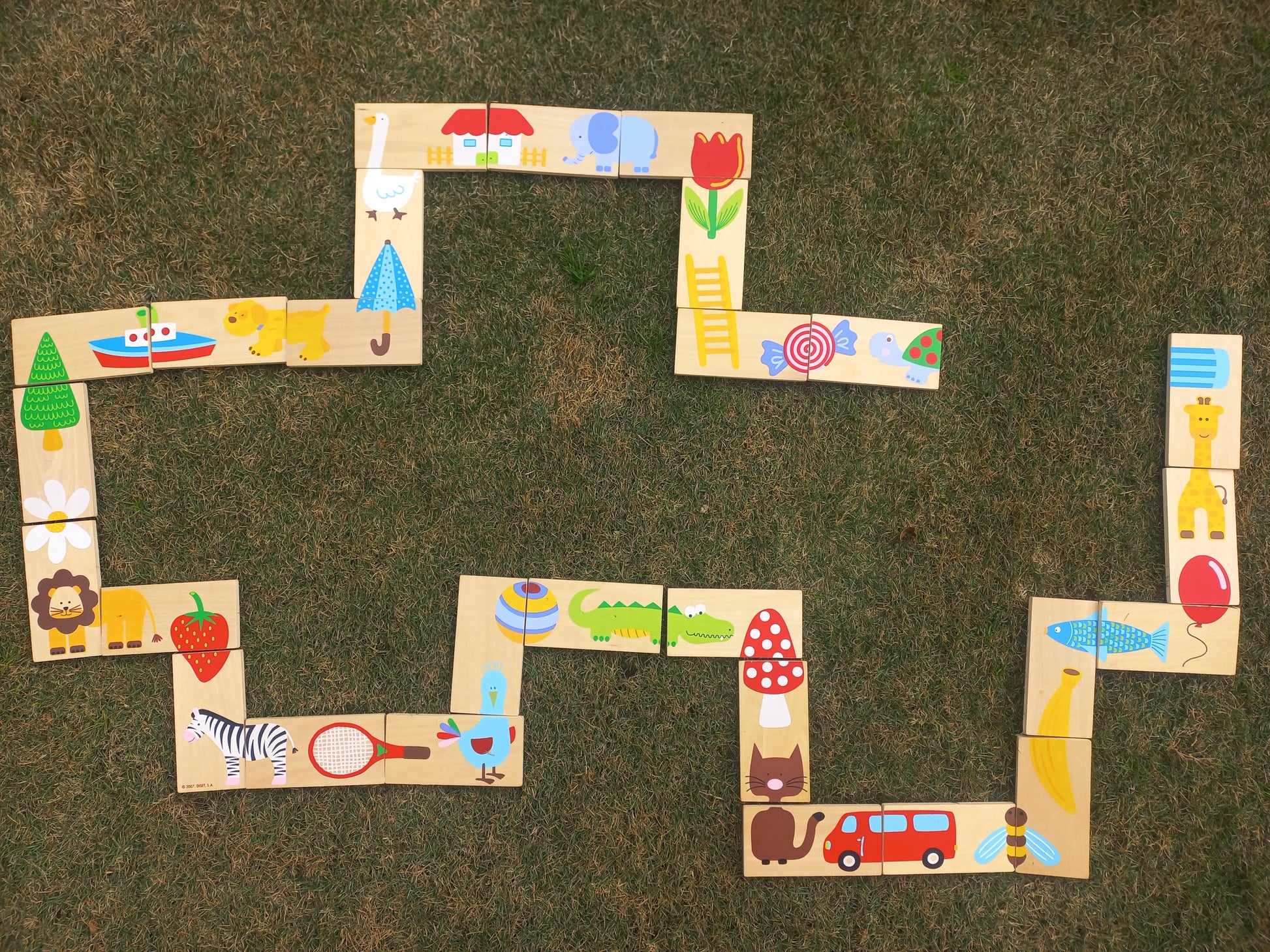 Wooden dominoes with brightly printed objects. Can be used as dominoes or puzzle.